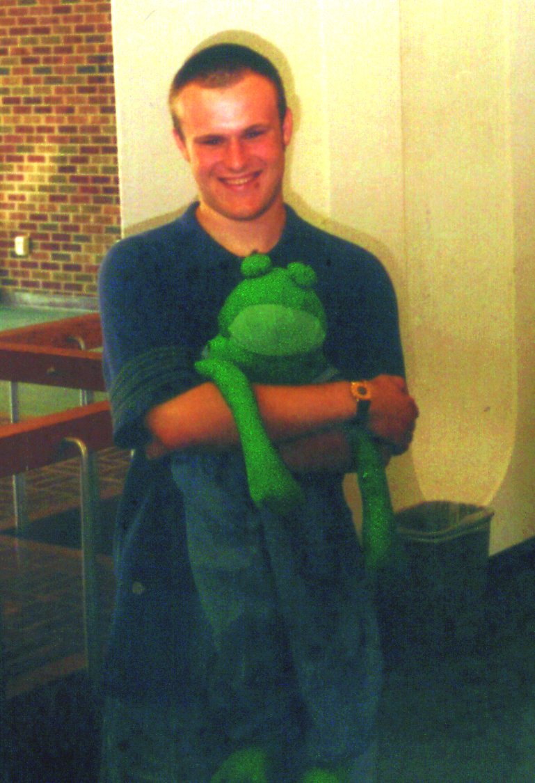 Well, we finally caught Frankie. This was on the final night, and Frankie, to say the least, had been causing some trouble. It all started with a simple little phone call, and ended up w/ pizza slices being launched at the 11th story of the ladies' dormitory. Then another telephone call was made, this time to the police, and the remainder of the 2 large cheese pizza's was stuffed into the muffler of the 2000 Taurus. However, Tim finally catches the small amphibian and hides him until the cops leave. Way to go Tim!
